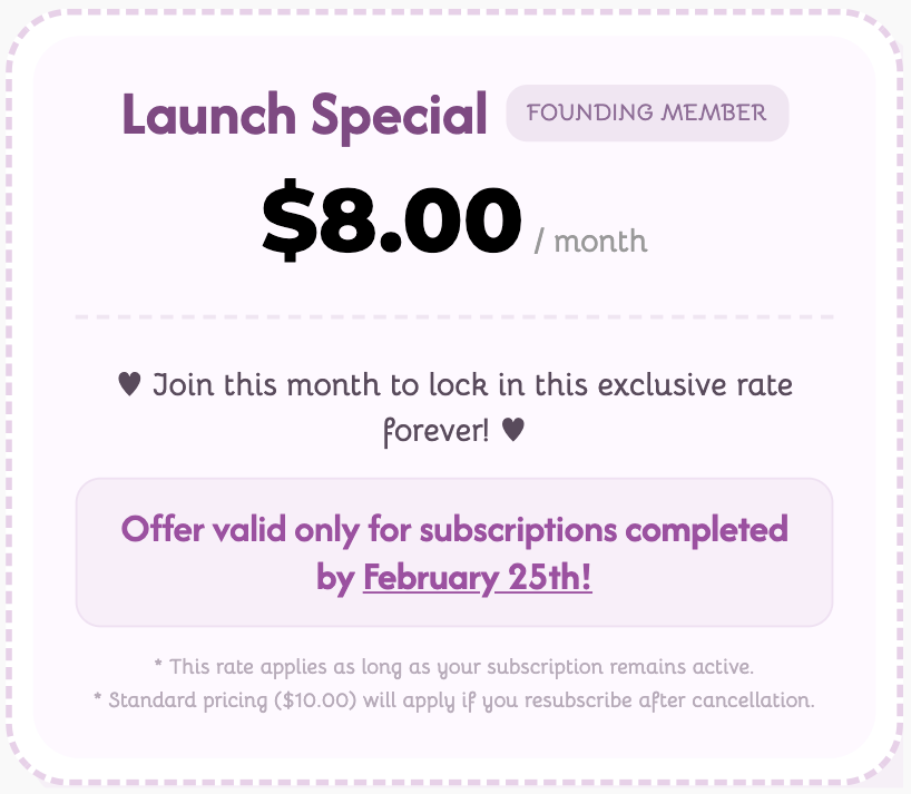 2. The “Founding Member” Rate Guarantee As a Founding Member, your exclusive rate ($8.00/month) is locked in forever! This special price will remain active as long as you maintain an active subscription. Please note that if you choose to cancel and decide to rejoin later, the standard rate at that time will apply.